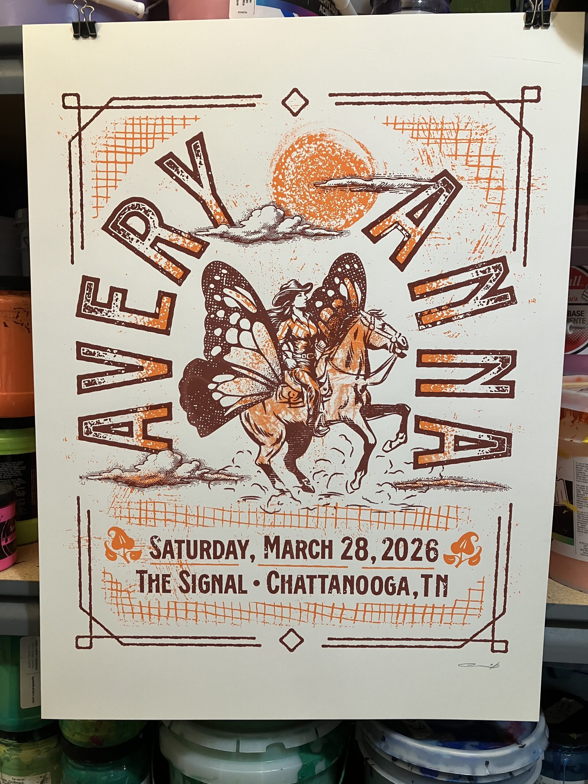 Poster for Avery Anna in Chattanooga, TN March 28, 2026 • Limited Edition / Two colors: Dark Burgundy & Orange / 18″x24″.