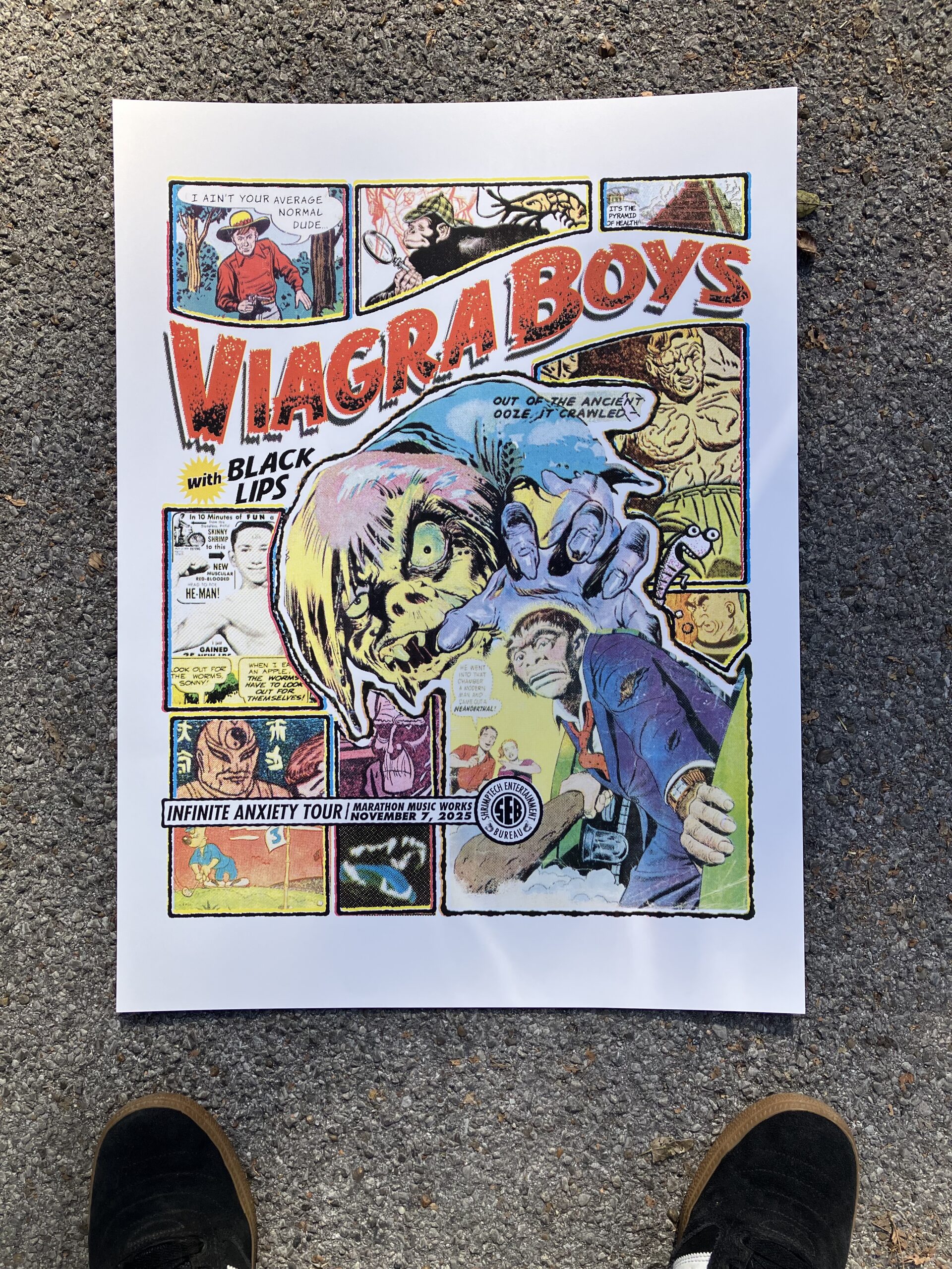 Poster for the Viagra Boys show at Marathon Music Works in Nashville, TN • Limited Edition / four colors / 18″x24″. Shrimps!